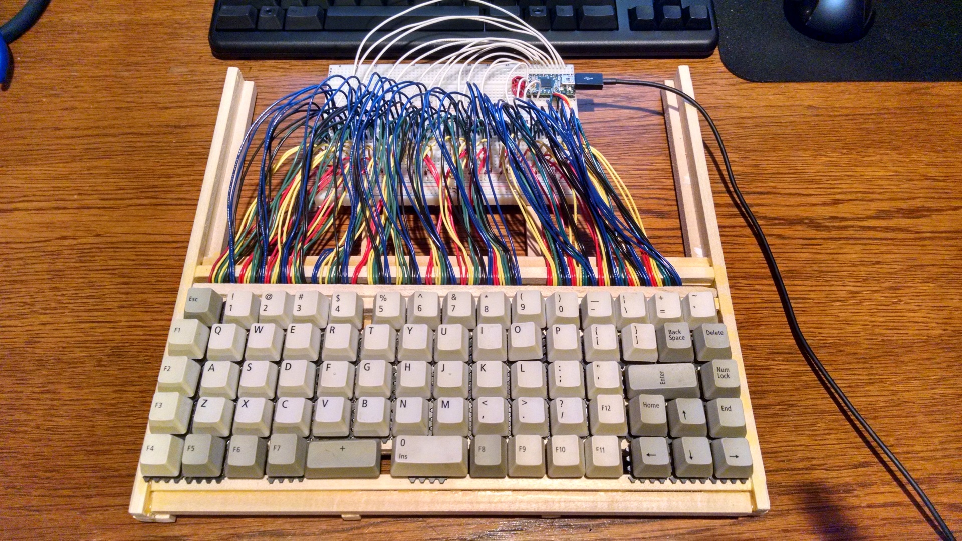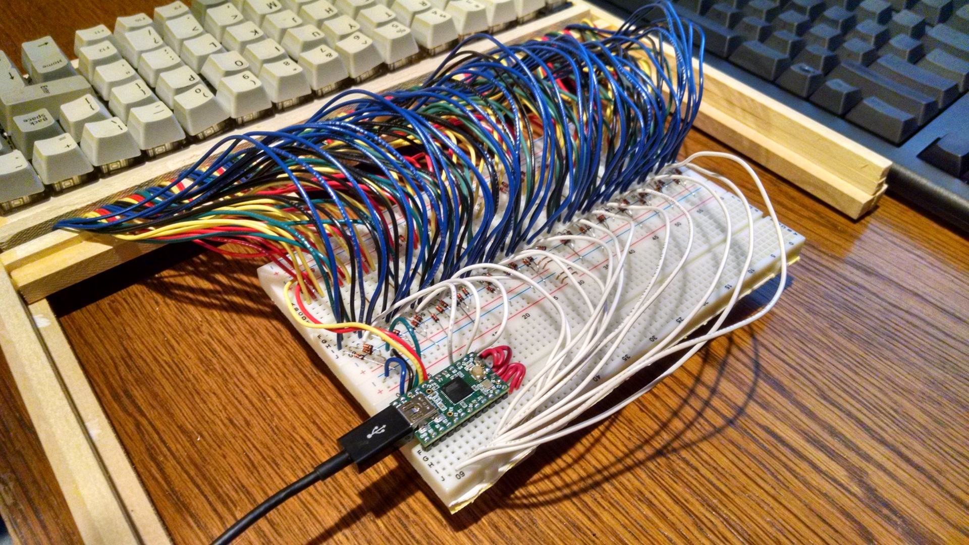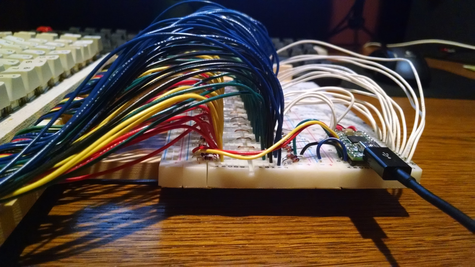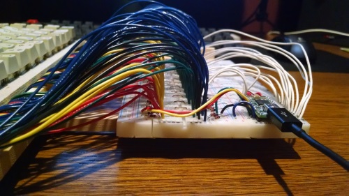 Here's the big mess of wires coming from the keys and going into the bread board. Each switch